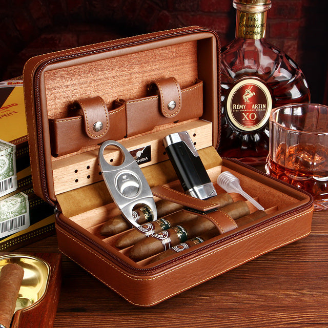 Spoljašnjost humidora je presvučena kožom a unutrasnjost je od španske kedrovine.